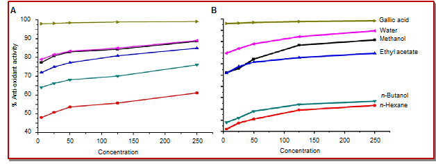 The radical scavenging activity of the different extracts from the stem is presented in Figure 3A. Methanol extracted fraction and water extracted fraction showed the highest radical scavenging activity at 250 µg/mL. The extracts according to the decreasing order of radical scavenging activity were methanol, water, ethyl acetate, n-butanol and n-hexane at the different concentrations. All these extracts possessed antioxidant potency at 5 µg/mL concentration (78.2% by water, 79% by methanol, 72% by ethyl acetate, 65% by n-butanol and 48% by n-hexane fraction). The different extracts of the leaves showed antiradical properties, to varying degree at different concentrations. The crude methanol extract possessed strong antiradical activity (94%) shadowed by water extracted fraction (91%) at 250 µg/mL concentration. The other extracts were also active at concentration of 250 µg/mL (i.e. 71% ethyl acetate, 69% n-butanol and 86% n-hexane). However, at minimum concentration level (5 µg/mL), the descending order of antiradical activity of extracts was methanol (82%), water fraction (80%), n-hexane extracted fractions (76%), ethyl acetate (59%) and n-butanol (58.3%).