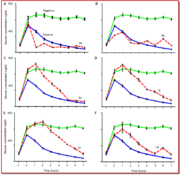 Synthesized analogues were checked for their in vivo antidiabetic activity. Plasma glucose at 7th hours for all the synthesized compounds is in the Table I. The compounds which lowered the blood glucose level, their results were compared with glibenclamide, while compounds that led to an increase in blood glucose concentration, their results were compared with diabetic non-treated mice. Graphical representation of some of the representative compounds which decreased the plasma glucose concentration near to glibenclamide is shown in Figure 1.