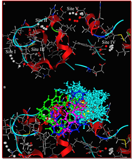 Figure 3: A) Active site of 3Q6E. Five active sites represented by alpha centers created by site finder module (MOE). B) Active site of human insulin protein (3Q6E). Docked poses of all the most favorable docked conformations of the ligands are shown inside the pocket. Ligands are presented in ball n stick mode while key amino acid residues are shown in elemental color, stick mode. Backbone receptor is presented in cartoon and ribbon form. Active sites are marked with grey and red colored spheres