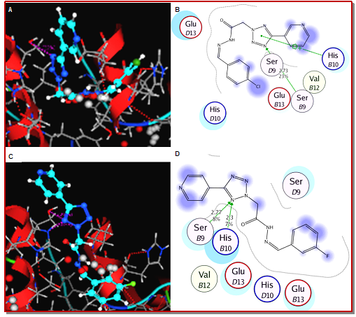 Figure 4: Molecular docking analysis of (3QE6). A, C) Docking pose of 9a and 10l in 3D space, molecule is shown in cyan color (ball n stick model) key residues are shown in elemental color (stick mode). The receptor is shown in red ribbons and cartoons. Hydrogen bonding interactions are shown in dashed purple lines. B, D) Docking pose of 9a and 10l in 2D space, hydrogen bonding interactions are shown in green colored dashed lines