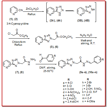 Synthesis of N'-(substituted-benzylidene)-2-(5-(pyridin-3/4-yl)-2H-tetrazol-2-yl)aceto hydrazides 9(a-n),10(a-n)
