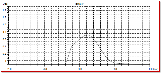The results from the optimized method for determining the hydroxycinnamic acid present in the fruits of S. lycopersicum are given below. The peaks under UV visible spectrophotometer were obtained at 310 nm for standard caffeic acid and sample peak was noticed at 210 nm (Figure 1 and 2).