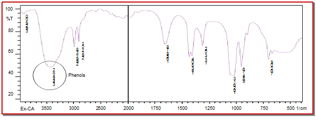 It has been accepted that a spectral band obtained at 3400 cm-1 showed a broad and strong indication of presence of -OH group, exclusively phenols (Nirmaladevi, 2010). These band range are assigned to the stretching vibration of hydroxyl groups that interact by H bonding (Guerrero 2014). A detailed band assignment of transmission and ATR-FTIR spectra of isolated tomato fruit cuticles ranges from 1500-1600 cm-1 (Ramirez et al., 1992; Espana et al., 2014). The structure of phenolic compounds is a key determinant of their radical scavenging and metal chelating activity. Structurally, phenolic compounds comprise an aromatic ring, bearing one or more hydroxyl substituents, and range from simple phenolic molecules to highly polymerized compounds (Bravo, 1998).