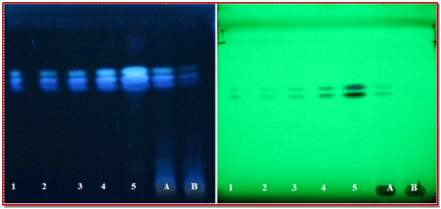 Figure 4: A developed HPTLC plate seen under 366 and 254 nm UV light. Lanes 1 and 5 contain the mixture of standards caffeic acid and coumaric acid at various concentrations ranging from 5 to 10 µg. Lanes A and B contains the hot water extract and sonicated + extract of Solanum lycopersicum fruits