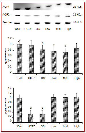 In addition, we also examined the expression of AQP1 in kidney cortex. The results show that the 59.7 and 119.5 mg/kg dose of washing elution fractions and DS decreased the expression of AQP1 in kidney, while hydrochlorothiazide had no effect on the expression of AQP1 in kidney (Tables V and Figure 1).