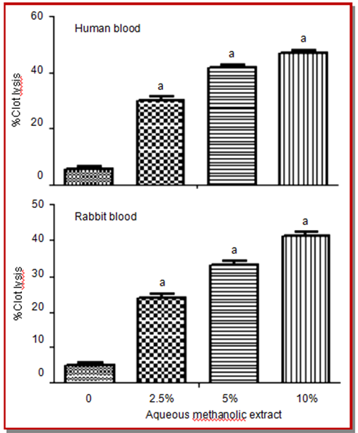 Solutions of different concentrations of aqueous methanolic extract (25, 50 and 100 mg/mL) were prepared. From the healthy volunteer and rabbit, venous blood was drawn. The sterile eppendorff tubes were taken and weighed them. Blood was distributed (0.5 mL/tube) to each previously weighed sterile eppendorf tubes and incubated at 37°C for 45 min to form the clot. Serum was totally removed after clot formation without disturbing the clot and each tube having clot was again weighed to find out the clot weight. In each eppendorf tube containing pre-weighed clot, a volume of 100 uL of test solution was added. 100 uL of distilled water was separately added to the control tube numbered as a negative control. All the tubes were then incubated at 37°C for 90 min and observed for clot lysis. Fluid released was removed after incubation and tubes were again weighed to observe the difference in weight after clot disruption. Difference obtained in weight taken before and after clot lysis was expressed as percentage of clot lysis (Prasad et al., 2006).