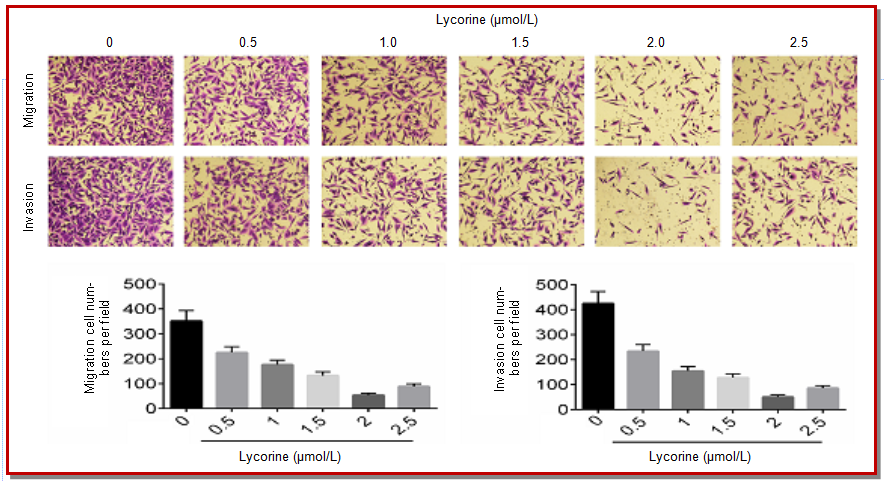 Cell migration and invasion were determined using a transwell chamber (Corning incorporated, USA). MDA-MB-231 cells (1x105 cells/well) were added into the upper chambers with 200 uL DMEM medium. DMEM media (600 uL) containing 10 FBS was added to lower chambers. Different concentrations of lycorine were seeded in both chambers. For the invasion assay, MDA-MB-231 cells (1 x 106 cells/well) were placed in the upper chamber coated with 30 uL matrigel (BD, USA). After culturing for 24 hours in 5% CO2 at 37°C, 4% paraformaldehyde was used to fix the cells in the upper chambers for H and E staining. Migrated MDA-MB-231 cells were counted in five randomly picked fields under microscope.