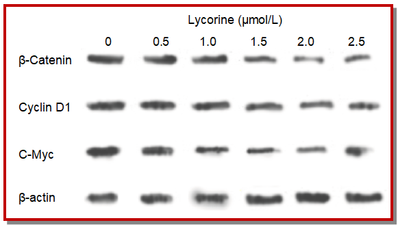 To further illuminate potential mechanism by which lycorine suppress the proliferation, migration and invasion in MDA-MB-231 cells, we investigated the effects of lycorine on the down-stream target proteins of Wnt/beta-catenin signaling pathway. The protein expression levels of β-catenin, cyclin D1 and c-Myc were significantly decreased in MDA-MB-231 cells treated with different concentrations of lycorine in a dose-dependent manner (Figure 3). The data suggested that the inhibitory effects of lycorine on the proliferation, migration and invasion of MDA-MB-231 breast cancer cells is associated with suppression of Wnt/beta-catenin signaling.