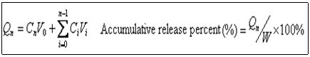 Qn was the accumulative release amounts at each time point, Cn was the measured concentration at each time point, V0 was the bulk volume of release medium, Vi was the sampling volume, Ci was the measured concentration at time point i, W was the total drug amounts in capsules