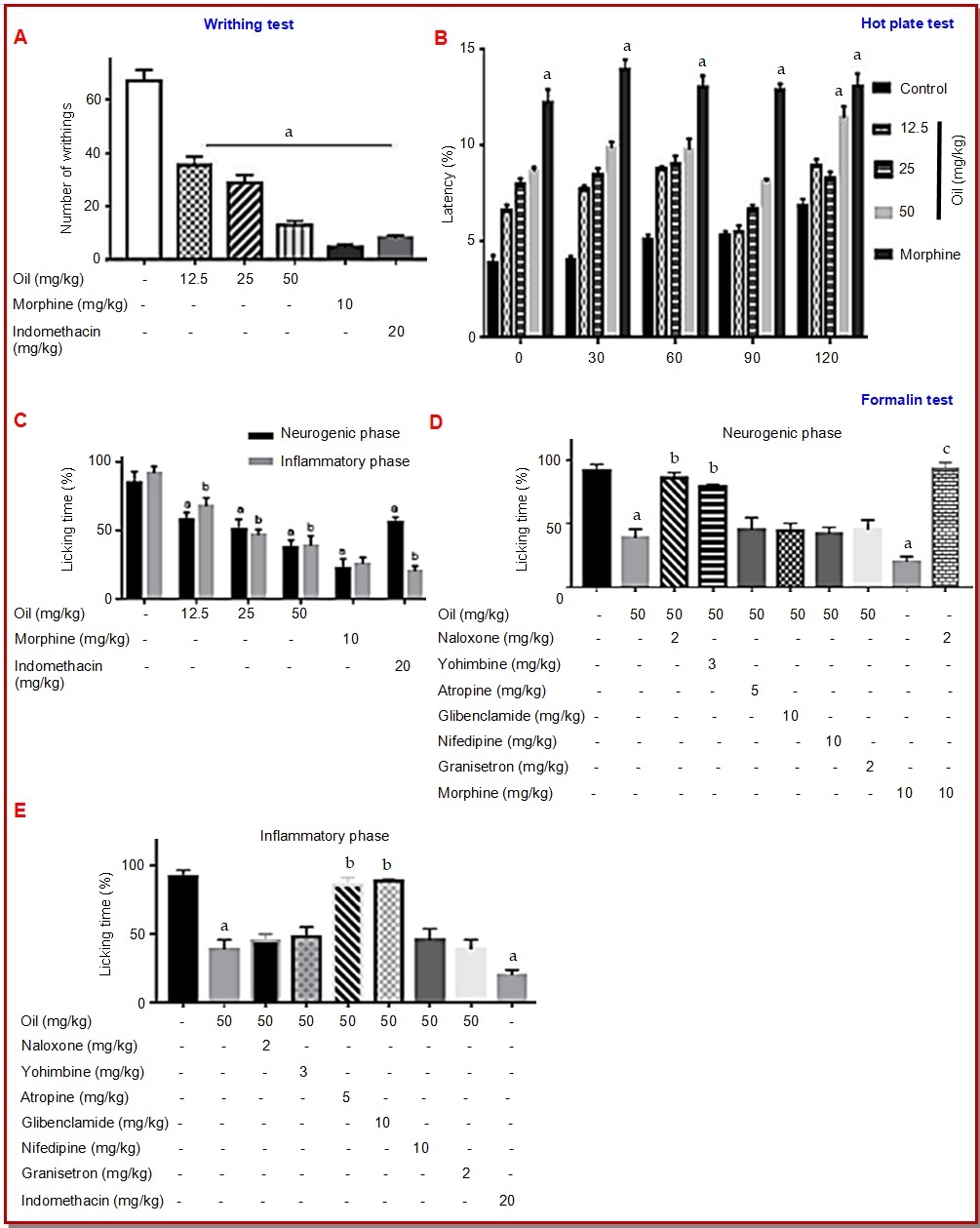 Figure 1: Antinociceptive (A-B) and analgesic (C-E) effects of P. lentiscus essential oil in writhing test, hot plate test and formalin test (neurogenic and inflammatory phases). Data are presented as mean ± SEM. ‘a’ indicates difference between negative control and treated groups, ‘b’ indicates differences between treated group and antagonists. ‘c’ indicates difference between indomethacin- and oil-treated group. Statistical analyses were done using ANOVA one-way followed by Tukey’s post hoc test