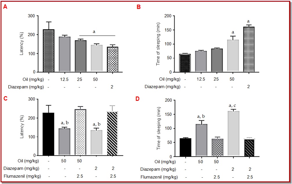 Figure 2: Effect of essential oil of P. lentiscus in the thiopental-induced sleeping time test and latency (n=6/group). Data are expressed as mean ± SEM, where ‘a’, ‘b’ and ‘c’ indicate p<0.05, significant difference from the treated group according to ANOVA one-way followed by the Kruskal Wallis test