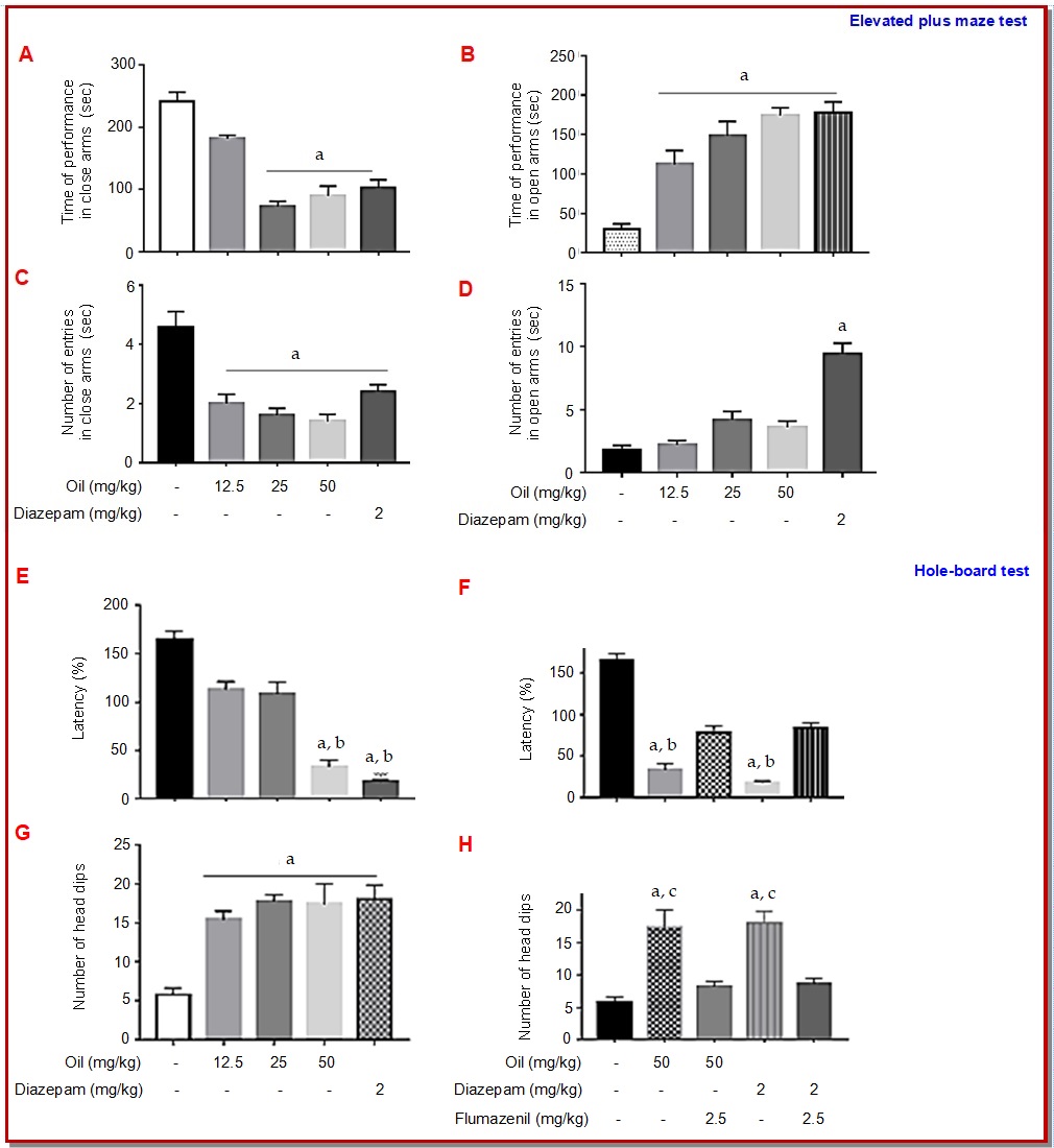 Figure 3: Effect of P. lentiscus essential oil in elevated plus maze test (A-D) and hole-board test (E-H) in mice (n=6 in each group). The results are expressed as mean ± SEM, “a†indicate significant difference between control group and treated groups. “b†and “c†indicate significant difference between treated group (50 mg/kg), diazepam and antagonists. Statistical analyses were done according to ANOVA one way followed by Kruskal Wallis/Tukey’s test