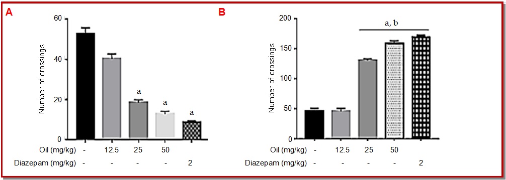 This test is used widely to investigate the degree of anxiety, exploration, and locomotion. The number of crossings were reduced significantly when mice were treated with essential oil at all biological doses (54%, 63%, and 71% respectively) (Figure 4). These involved a possible dose-dependent antianxiety effect. However, the immobility time increased in comparison to the negative control. Diazepam exhibited the same results.