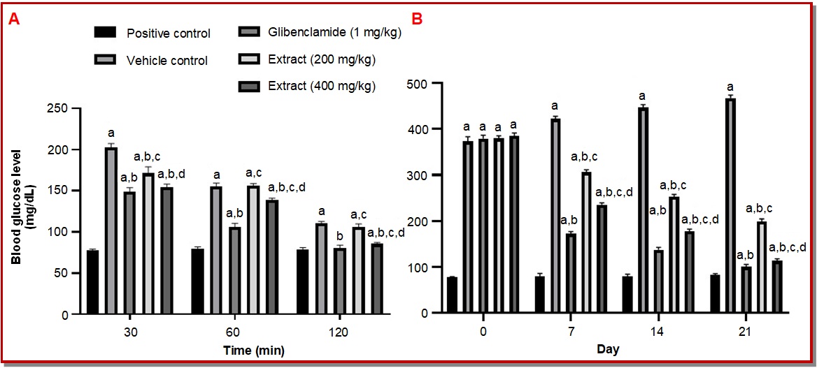 Figure 1: Effect of hydroalcohol extract of A. wallichii on oral glucose tolerance test (A); and anti-diabetic effect in streptozotocin-nicotinamide type-2 diabetic rat (B). Superscript a, b, c, or d denotes p<0.05 when compared with positive control, vehicle control, glibenclamide (1 mg/kg) and extract (200 mg/kg)