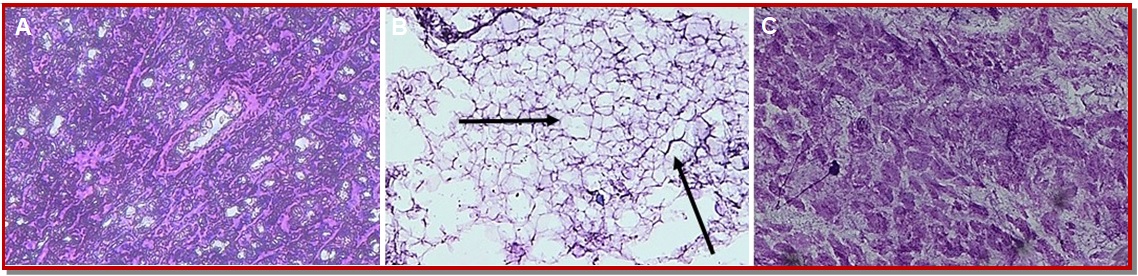 Figure 2: Histological observation of pancreas in streptozotocin-nicotinamide type-2 diabetic rat. ‘A’ represents the control group; ‘B’ represents the streptozotocin-nicotinamide-treated pancreas showing the formation of necrosis as presented by arrows; ‘C’ represents the A. wallichii extract (400 mg/kg)-treated group showing the reversal of pancreas necrosis